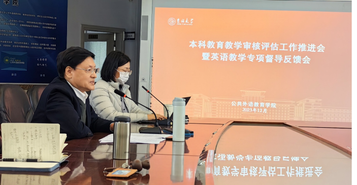 为深入贯彻《吉林大学本科教育教学审核评估工作方案(修订稿)》(校发〔2023〕176号),扎实做好本科教育教学审核评估迎评准备工作,根据《吉林大学学院本科教学评估工作方案(校教字〔2023〕70号)》安排和《关于开展本科教育教学审核评估第一轮学院自评工作的通知》要求,公共外语教育学院于12月5日在外语楼六楼报告厅召开英语教学专项督导反馈会暨本科教学审核评估工作推进会。我院领导班子全体成员出席会议,学院教学委员会委员、督学、各教研室主任及支部书记、各科室科长以及教学办全体成员参加了此次会议,会议由院长潘海英教授主持。