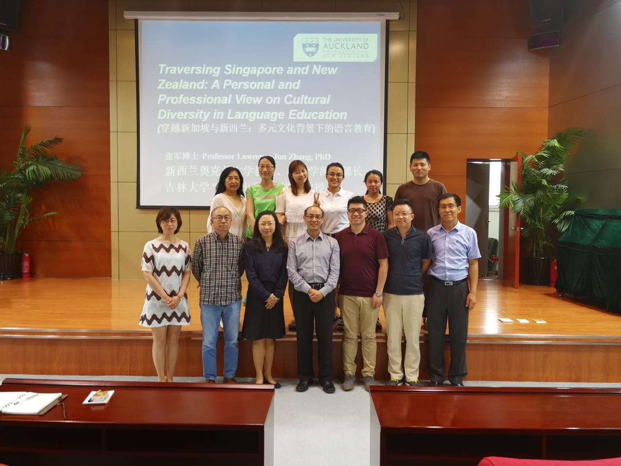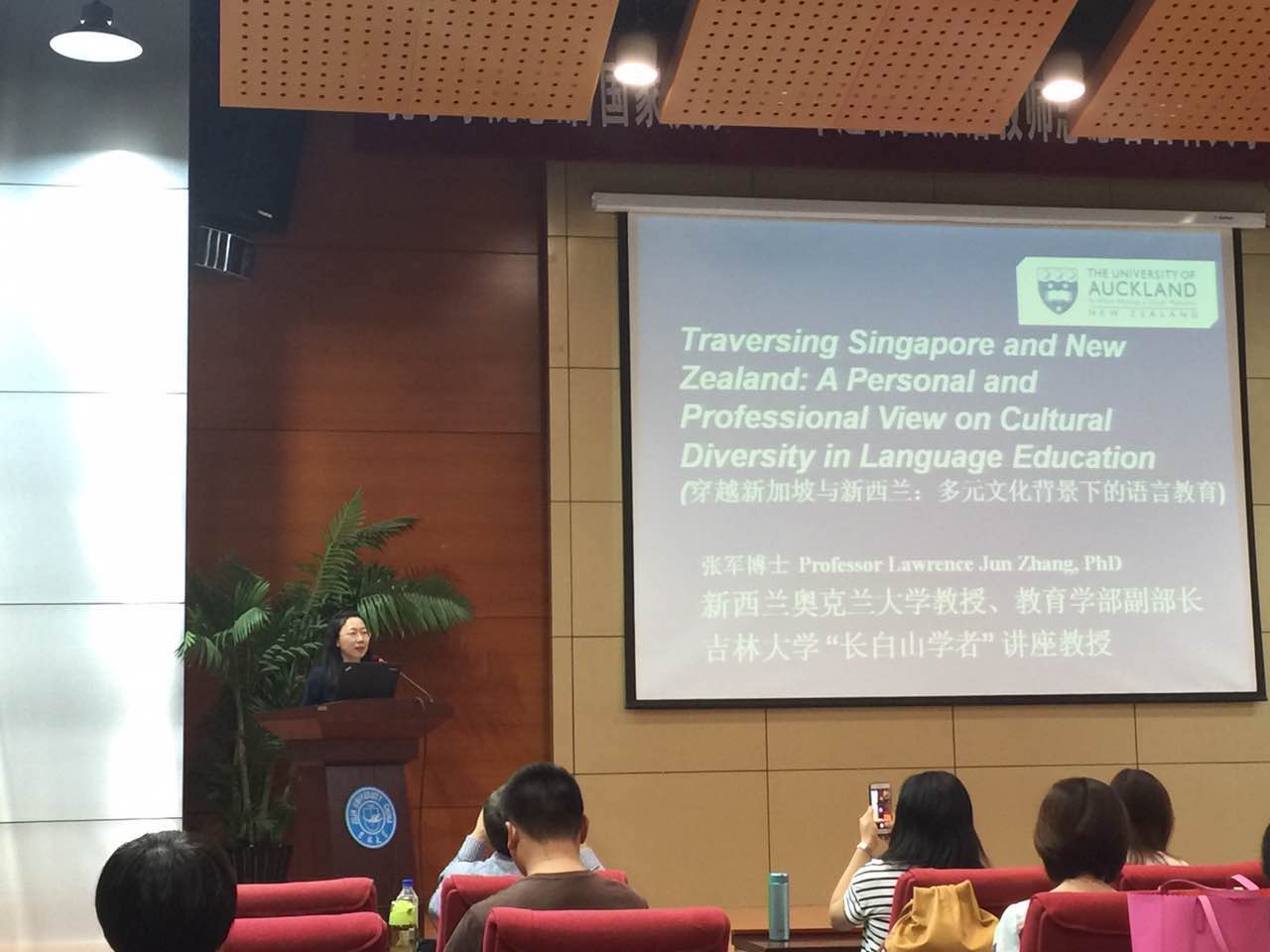 2017年6月23日,由乐鱼最新网页登录、吉林大学高校外语教育研究中心和吉林大学学生就业创业指导与服务中心共同举办的吉林大学“国际组织人才培养与推送”系列讲座第三讲,暨乐鱼最新网页登录“国际组织 中国参与”系列讲座在国际大讲堂顺利举行。本次讲座邀请新西兰奥克兰大学教育学院副院长、吉林大学“长白山”讲座教授张军教授为参会的老师与同学们做了题为“Traversing Singapore and New Zealand: A Personal and Professional View on Cultural Diversity in Language Education”(穿越新加坡与新西兰:多元文化背景下的语言教育)的主题讲座。学院院长潘海英教授、副院长王守宏教授和我校师生共同参加了本次讲座,讲座由潘海英教授主持。