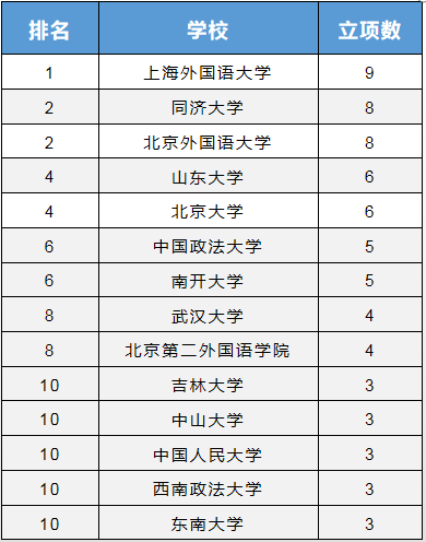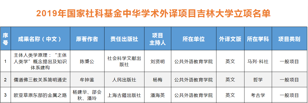 2019年12月25日,全国哲学社会科学工作办公室公示了2019年国家社科基金中华学术外译项目立项名单,共有154个项目进入公示名单,我校有3项入选,项目主持人均来自公共外语教育学院,立项数位列全国第十! 2019年国家社科基金中华学术外译项目立项数排名前十学校