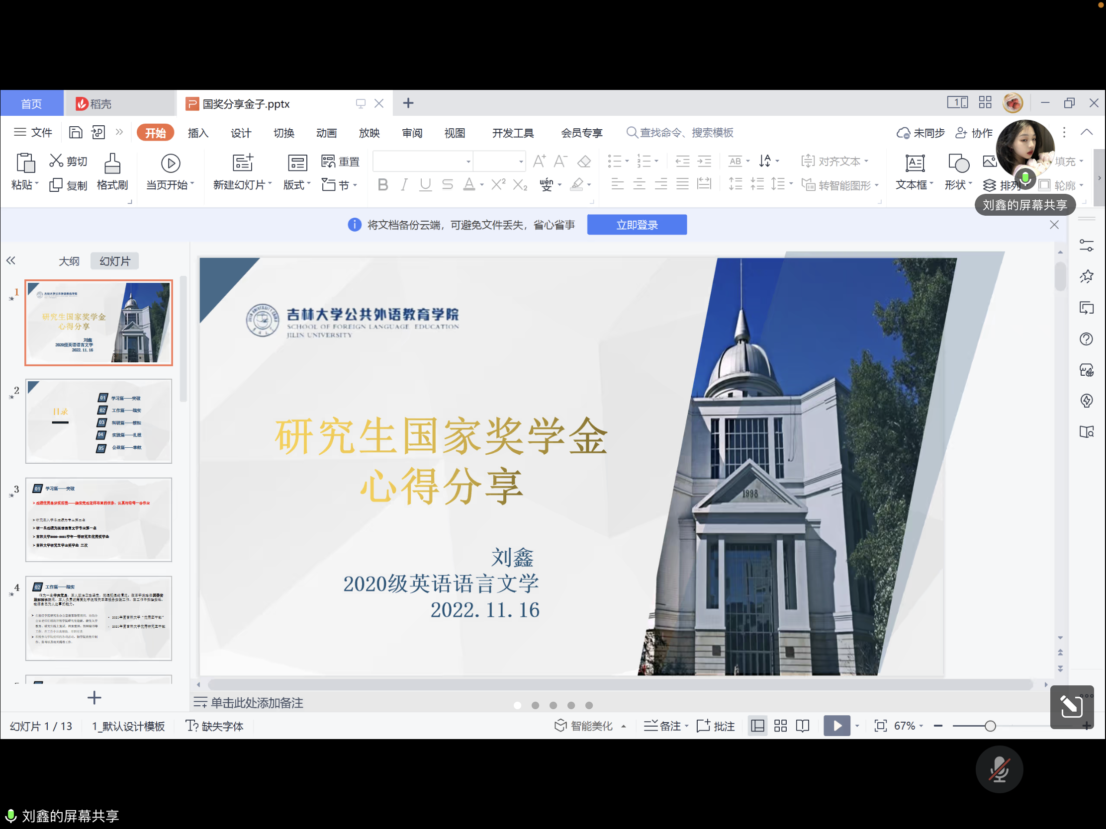 交流学习促进步,分享经验共提升。为帮助大家更好地了解国家奖学金、学习优秀研究生的精神,2022年11月16日,公共外语教育学院线上举办了研究生国家奖学金经验分享会。本次会议由公共外语教育学院研究生会学术部部长武铭伦主持,研究生辅导员曾媛出席本次分享会,特邀三名国家奖学金获奖同学分享学习经验,全体2021、2022级研究生参会。