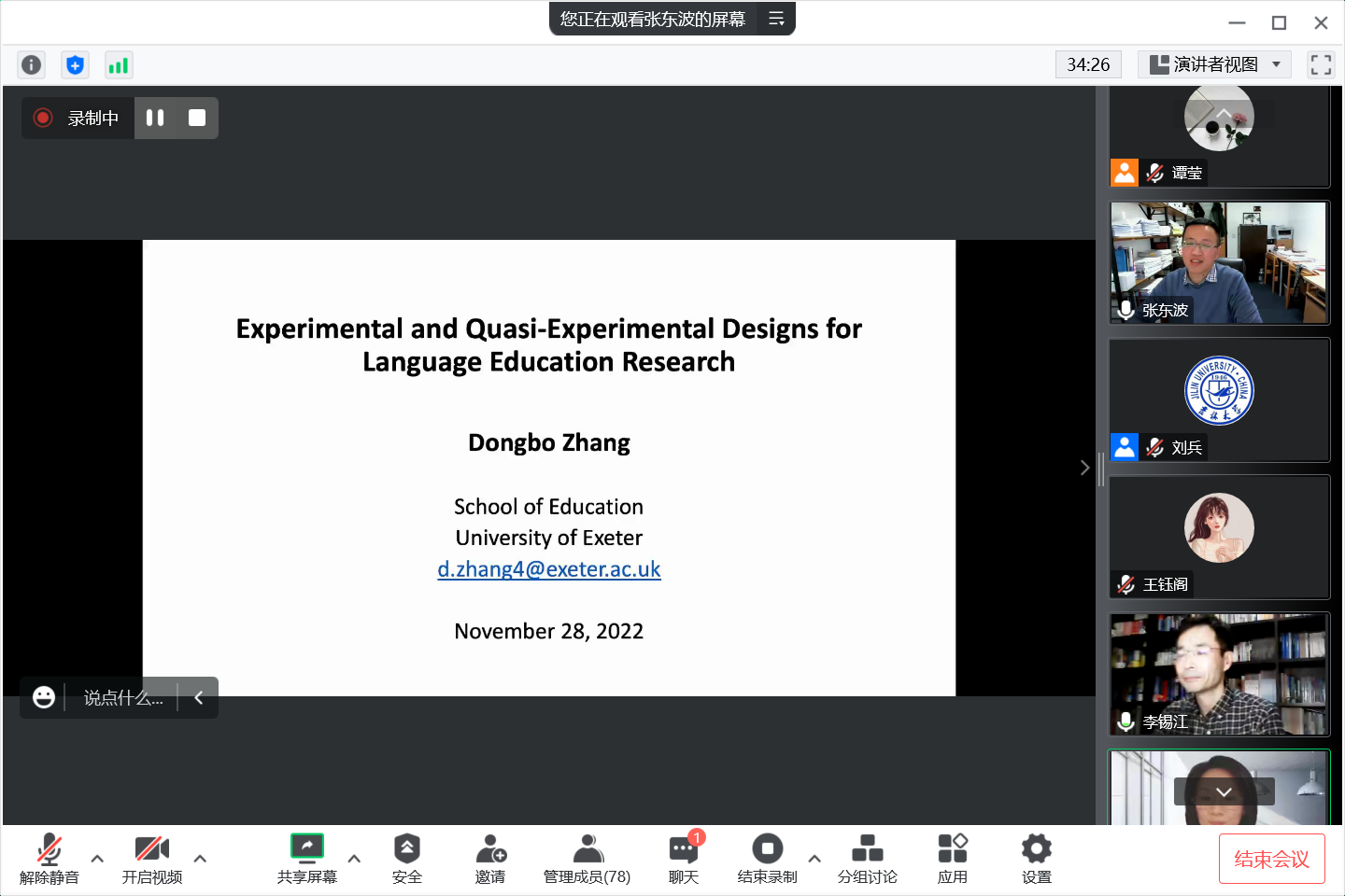 应乐鱼最新网页登录邀请,国际知名应用语言学学者、英国埃克塞特大学Zhang Dongbo教授,于2022年11月28日在线上进行专题学术讲座。讲座由副院长张锦教授主持,校内外广大教师和学生参加了此次讲座。
