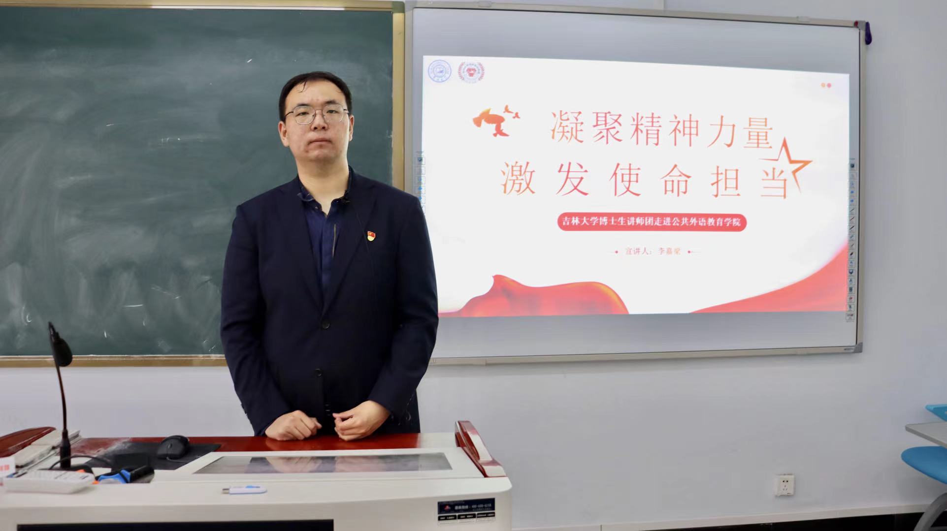 为深入学习宣传贯彻习近平新时代中国特色社会主义思想和全国两会精神,充分发挥博士生讲师团理论宣讲作用,引领广大青年学子学深悟透党的新理念、新思想、新战略,坚定历史自信,坚持守正创新,深刻领悟好、践行好全国两会精神,2023年5月4日青年节之际,吉林大学博士生讲师团讲师李嘉梁走进公共外语教育学院开展理论宣讲。本次宣讲的主题是“凝聚精神力量 激发使命担当”——实施科教兴国战略,强化现代化人才支撑。公共外语教育学院研究生党支部党员、中共预备党员、助管、研究生干部参与了本次活动。
