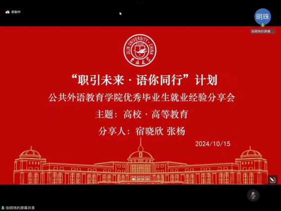 为引导研究生树立正确的择业观,帮助研究生更好地了解就业和升学形势、掌握技巧,公共外语教育学院于2024年1015日晚和10月18日晚分别举办“职引未来·语你同行” ——高校·高等教育就业经验分享会和申博升学经验分享会。分享会由学院就业兼职辅导员张明珠主持,学院2024届毕业生宿晓欣、张杨、2024级博士生马倩主讲,研究生辅导员林明帅和各年级研究生同学线上参会。