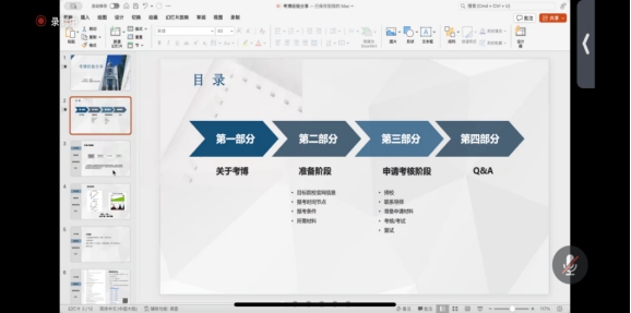马倩结合自身申请博士研究生的经验,对关于考博的过程进行了详细回顾,提交申请材料、资格审核、综合考核以及拟录取等多个方面,并分享了各个阶段的时间点。接着马倩申请博士的准备阶段和申请考核阶段,对如何获得院校博士申请信息、报考时间节点、所需材料以及择校、联系导师、考核具体过程进行了十分详细的讲解。